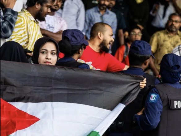 Police removed spectators carrying placards reading ‘Ban Israel from FIFA’ from the National Stadium in Malé on Friday during an...